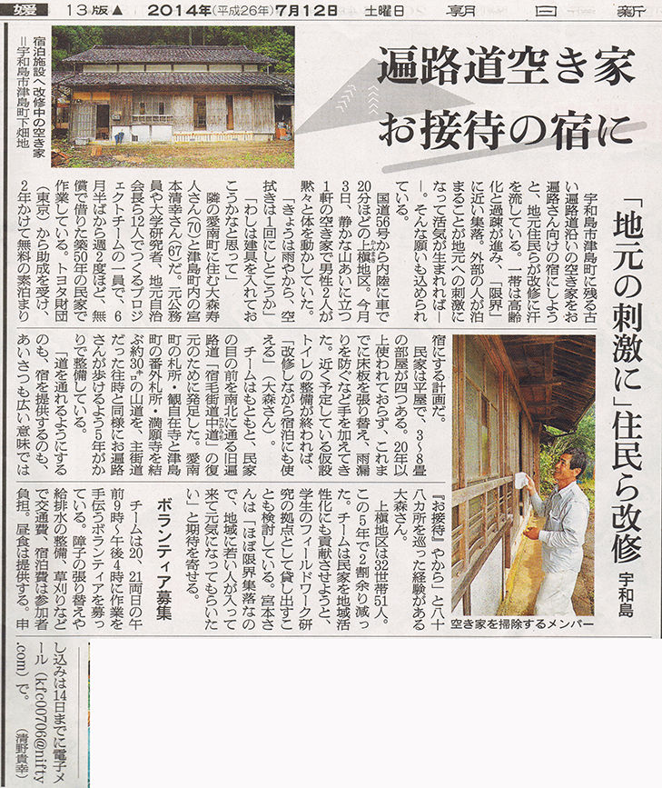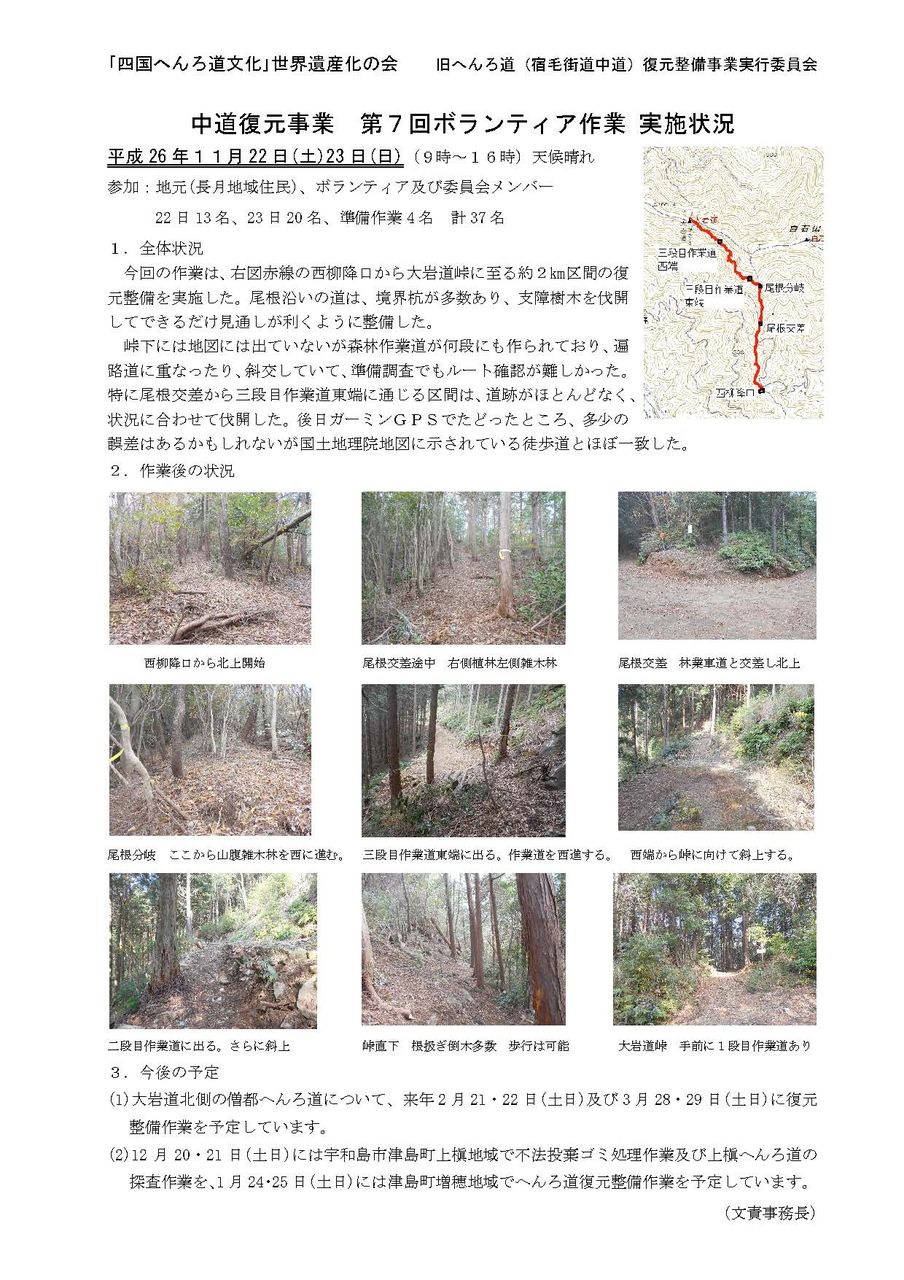 中道復元事業 第7回ボランティア作業 実施状況 平成26年11月29日 2014年11月29日 |お知らせ 上槇プロジェクト ボランティア作業(第2回) 実施状況 平成26年7月25日 2014年07月25日 |お知らせ 旧遍路道の復元事業が朝日新聞に取り上げられました。 2014年07月22日 旧へんろ道(宿毛街道中道)復元整備事業実行委員会が旧遍路道の復元に取り組んでいる愛南町の上槇地区で、お遍路さんの宿泊施設として旧家を再利用する活動が、朝日新聞の愛媛県版(7月12日付)に掲載されました。宮本委員長と大森事務長が紹介されています。 |お知らせ «1...2122232425» 最新記事 お接待報告(10月13日) お知らせ(平和への祈り8・15) お接待報告(7月12日) 「四国へんろ道文化」世界遺産化の会の2025年度(令和7年度)の通常総会を7月6日に開催いたしました。 NPO法人遍路とおもてなしのネットワークの総会に参加しました。 カテゴリー フォーラム (12) 活動報告 (12) イベント (14) へんろ道復元 (25) 世界遺産 (3) お接待 (5) 月別アーカイブ 2025年10月 2025年07月 2025年06月 2025年05月 2025年03月 2025年01月 2024年11月 2024年10月 2024年09月 2024年07月 2022年03月 2021年09月 2021年07月 2021年03月 2020年08月 2020年03月 2019年05月 2019年04月 2019年03月 2019年01月 2018年06月 2018年04月 2018年03月 2017年05月 2017年03月 2017年02月 2016年11月 2016年09月 2016年06月 2016年05月 2016年04月 2016年03月 2016年02月 2016年01月 2015年12月 2015年11月 2015年09月 2015年07月 2015年06月 2015年05月 2015年04月 2015年03月 2015年01月 2014年12月 2014年11月 2014年07月 2014年04月 2014年02月 2014年01月 2013年11月 2013年09月