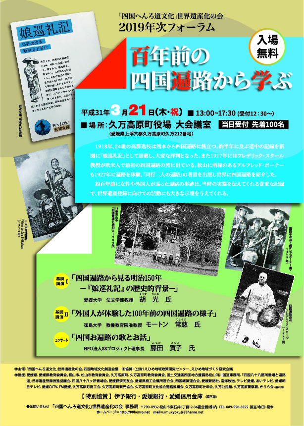 「百年前の四国遍路から学ぶ」をテーマに、2019年次フォーラムを平成31年3月21日(木・祝)久万高原町役場で開催します。入場無料で先着100名様です。